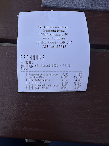 Wir waren zu Mittag bei Gerti zum ersten mal essen. Ein Traum ich habe schon lange nicht mehr so gutes Cordon Bleu mit ganz frisch abgemachten Salat gegessen. Das muss Mann eine Cholesterin Tablette am Abend mehr zu sich nehmen wert sein :-) Alles ging sehr schnell obwohl der Gastgarten bum voll war und Preislich ein Hit. Da sollten jamernde Wirte hinfahren und sich anschauen wie Gastronomie funktioniert. Dankeschön Frau Wirtin und an das ganze Personal. Kommen sicher bald wieder, aber mit der ganzen...