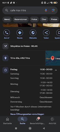 Read moreSeit 1977 kommen wir nun schon nach Trins, und seit dem gehen wir, zunächst beim Vater, danach beim Sohn in diesem Lokal regelmäßig Essen, Trinken Feiern und Abhängen. Die Einrichtung ist urig und ok, etwas in die Jahre gekommen, auch wenn die Polster der Sitzgelegenheiten vor kurzem erneuert wurde. Aber wer mehr auf feudal und mondän und schickimicki steht, der ist hier meiner Ansicht eh falsch aufgehoben. Wer allerdings echte gastfreundschaft, hervorragenden freundlichen und schnellen Service sucht, verbunden mit stets gleichbleibend gutem, reichhaltigen und unglaublich leckerem Essen, der sollte unbedingt mal hier einkehren. Achtung sehr klein und vor allem sehr beliebt auch oder gerade bei Trinsern. Daher unbedingt Tisch reservieren. Lieber Max bitte bitte hör nie auf, so...