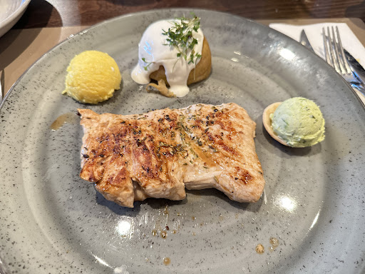 The place looked busy and smelled delicious - grilled steak outside - cannot go wrong! Firstly we were greeted by a server who told us to wait a moment, in the mean time diners who came in after us were being seated by other servers! There is a buffet bar for salads, bread, and other foods to be used as a starter and you can go here as often as you like but this was not explained to us by the server - we had to ask! I ordered a very well done rump steak with a 'jacket- potato and garlic butter. The steak was still bloody and the potato was not a jacket - it was an oven steamed helf potato and the garlic butter was green - herb and garlic. I asked for my steak to be cooked for longer. It came back 5 minutes later but my potato now had sour cream poured on it which i had already said no to so they took it away again and for the 3rd time served me a steak. It was eventually edible but the experience of having to retuen food is upsetting to me. I would not...
