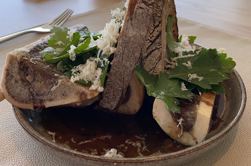 Auf dem großzügigen Areal lockt die schöne Terrasse zum verweilen, zumal bei meinem Besuch Anfang April strahlender Sonnenschein herrschte. Allerdings ließ ein eisiger Wind keine Wärme aufkommen und der Außenbereich lag noch im Schatten. Aber das war zu verschmerzen, denn auch der Innenraum ist zwar geschmackvoll modern und sachlich gestaltet, wirkt aber gleichwohl behaglich. Dass ich mich hier von meinem Eintreffen bis zur Verabschiedung wohl gefühlt habe, lag aber nicht nur an der warmen und entspannten Atmosphäre, sondern vor allem an den stets aufmerksamen und umsichtigen Servicekräften, von denen ich herzlich begrüßt und während meines gesamten Aufenthalts sehr gut betreut und versorgt wurde.