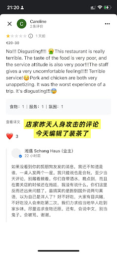 难道打差评就应该被人身攻击吗? 1.没有任何要求一桌人只能一个人评论,吃过这顿饭的每个人都有评论的自由。2.我们事先不知道不能自带奶茶哈 当你看到我们在喝奶茶 就应该制止 而不是现在说3.晚点到是什么意思?不要给我们扣帽子。我们在14:17给你打了电话向你询问是否可以用餐,你给了非常明确的答复。我们也明确回答了你打车大概14:30左右到达。我们也在14:35到达。4.你们在15;02的时候才上齐菜,在14:54的时候就告诉我们15:00休息,要求我们快点吃(原话)。后来按你的要求我们在15:04的时候就结账。并且你也不主动提供小票,是我们要你才在15:08打的。你说的要关店的时候还在拖延是指我们在4分钟没有吃完四道菜吗(还有一道菜还没上)5. 谷歌地图是国际化且公平公正的平台 用英文写评论是为了让所有顾客都看明白。6.临沂炒鸡和xhs晒出来的图完全不一样,一点味道都没有。又想挣这份钱又不想晚下班还要辱骂客户。...