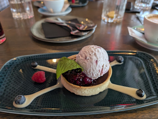 The desserts were/ to quote Frank Zappa/"cheesy, but nicely displayed." They tasted exactly like little cakes that you buy frozen at the discount store and then thaw when needed and jazz up with ice cream, fruit and jam. Mine was described as chocolate hazelnut tart on the menu and was Choux pastry with Nutella on it. They added raspberries, blueberries, vanilla sauce and cherry ice cream(?), which didn't blend particularly well with the raspberries and the rest. Why? We "spent" about € 120,- for two main courses, 2 desserts, two non alcoholic drinks and two coffees, which is - considered overall - rather expensive for Austrian standards. Sorry guys, although the steak was really good, I've eaten much better food at places with politer and more...