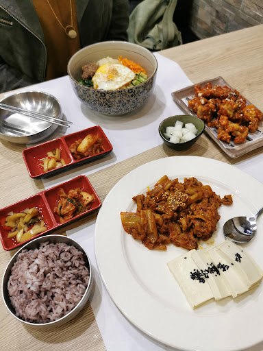 Went there with my sister for dinner and the starter and the main dish were brought together at the same time for my sister way before me so she had to wait until I got my food as well. Shortly afterward my food came which was a Yukgaejang stew but my starter was nowhere to be seen and I inquire the tanned Asian waiter about it and believe it or not, he told me in an extremely rude manner that I had to specify the starter be brought first before the main course when making my order. I still tipped because the owner was so nice and friendly. The fried chicken was perfect but the broth of the stew tasted just like spicy hot water with 5 shredded pieces of meat, tons of green onions, glass noodles, and an egg in it. No vegetables like fernbrake or mushrooms which I usually get at Sura Restaurant in the first district. I mean I didn't expect the Yukgaejang to taste like what I had in Seoul but even the instant Yukgaejang ramen broth has more depth...