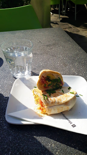 I had a delicious Breakfast Burrito, meaning a burrito filled with scrambled eggs, onions, melted cheese, cream cheese and tomato as well as chives. You also can have some breakfast bacon as extra topping on your Breakfast Burrito. It is just relaxing to sit on this nice little square in the middle of bustling city life for having a time-out.