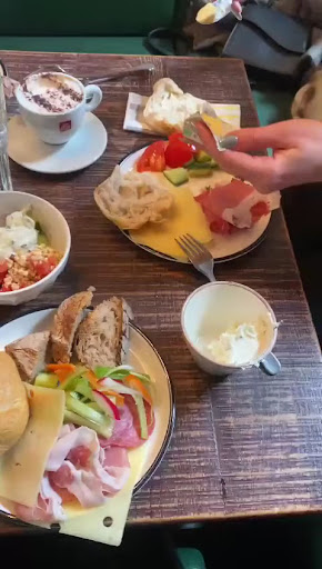 Read moreUpdate 9.5.2022 Hätte gerne mehr Sterne gegeben; leider wird's nichts... Diesmal wegen des Brunch. Den gibt es hier am Wochenende und an Feiertagen zwischen 11 und 15h. Wir trafen um 13.50 ein. Es gab kein Porridge mehr, keinen Lachs, statt 5 Käsesorten nur eine, die Nudeln waren lauwarm und trocken, der Obstsalat in große Brocken geschnitten, von denen man abbeißen musste, und die Zuckermelonen darin waren hart und unreif. Für den Erdäpfelsalat hatte man mehlige verwendet, die nicht durchgekocht waren. Es wurde nichts mehr nachgefüllt (außer Falafel) und für das Aufessen der Restbestände wurde ungerührt der volle Preis verrechnet. Vielleicht wäre es eine Idee, ab 14h nur mehr den halben Preis zu verlangen? Zwei Lichtblicke: das weiche Ei, das in einem kleinen Strohnest serviert wurde, und der Honig, den man sich aus einer Naturwabe schneiden konnte. —--------------- Sind zum Spätstück gekommen - tatsächlich war auch gar nichts los um 11h an einem Wochentag, also alles frei. Die Einfahrt ist sehr attraktiv gestaltet mit scheinbar endlos vielen Sitzgelegenheiten, Riesenlampions und Schaffellen auf jedem Sessel. Leider auch die Heizstrahler an, obwohl kein Mensch da - das kostet einen Stern für ökologische Unvernunft. Die Auswahl an Frühstücken ist ausgesprochen üppig - da findet jedeR etwas, von klassisch wienerisch bis orientalisch. Ich hatte schon seit Tagen auf die Pancakes mit Heidelbeeren und Ahornsirup gespitzt, dazu einen Latte Macchiato mit sehr feinem, weichem und doch standfestem Schaum. Die Pancakes (eigentlich Liwantzen, würde meine Oma sagen) waren knusprig, fast ein wenig zu sehr; der Teig dafür g'schmackig und die Heidelbeeren riesig. Beim Ahornsirup bin ich gern auf der charaktervollen Seite - dieser war eher einer von der sehr, sehr milden Abteilung, und auch nicht viel davon, dafür eine Menge Staubzucker (der da original kanadisch gar nicht draufgehört). Die Portion war etwas für den kleinen Hunger, aber dafür auch nur 5,50. Dazu einen Melonenspritzer: Der kostet mit über 4 Euro fast soviel wie das Frühstück selbst, hat sich aber gelohnt. Ausgesprochen erfrischend, duftige Minzblätter und ein Hauch von Frizzante. Leider mit Plastik-Strohhalm - das wäre heutzutage wirklich nicht mehr nötig und bringt den nächsten Sternabzug. Der Frühstücksburger war ausgesprochen üppig, eine volle Mahlzeit mit Eierspeis von zwei Eiern und einer ausgiebigen Portion Pommes Frittes; frisch aus der Fritteuse und sehr angenehm im Biss. Ich habe vor, demnächst ihren Brunch um 18,90 auszuprobieren und hoffe sehr, dass die Plastik-Strohhalme bis dahin...