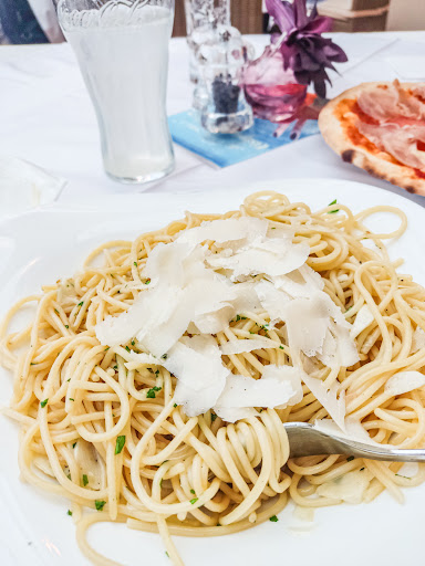 Ich bestellte dann Spagetti Oglio e Aglio. Meine Bitte um Parmesan wurde freundlich breit grinsend sofort mit frisch gehobeltem Parmesan im Schüsserl erfüllt. Erwähnenswert: Richtig viel Knoblauch. Und zwar junger (ohne dunklem Kern), Hauch zart und sehr gleichmäßig geschnitten. Leider kein Peperoncino, auch nicht auf Nachfrage. Getrocknet oder aus dem Glas erfüllen sie halt nicht den Zweck wie in Molise (Herkunft des Gerichtes) angedacht. Das tut dem Geschmack hier aber keinen Abbruch.