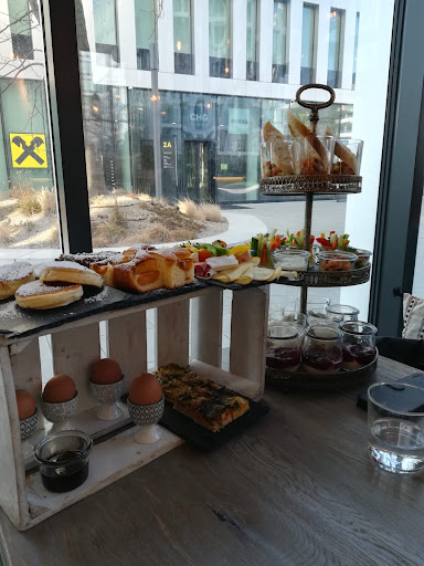 Das Ambiente ist sehr schön, die Keller:innen wirken aber gestresst und strahlen keine Entspannung bzw. Gastfreundlichkeit aus. Nur eine Kellnerin am Schluss war freundlich, als sie Prosecco nachgeschenkt hat. Abgesehen von dem Pancake, dem Joghurt im Glas mit Früchten und dem "weichen Ei" war alles echt gut und die Produkte wirkten von einer guten Qualität. Ich fände es besser wenn man sein Gebäck vorher selber wählen könnte und auch wie man sein Ei haben möchte. Für mich ist es halt auch kein Brunch, sondern ein Frühstück, mag sein, dass man es auch zu Mittag essen kann, aber es sind eigentlich keine Speisen für ein Mittagessen dabei. Grad einmal die Bohnen, wobei man die ja auch zum Frühstück isst, und die Quiches, die Stückchen sind aber auch sehr klein. Alles in allem ist es mir zu diesem Preis...