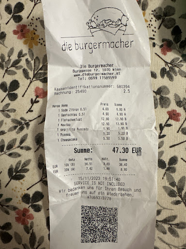 I want to start this review saying that the experience that we had on this restaurant was AMAZING. We went here the 15/11/2023 at 18:30pm more less. We were a little lost and we found this restaurant on Google maps. One of the best things that we loved aboyt Viena is that everyone speaks english and this place was not the exception. The man that attended us was so nice and he gave us a good table by the window. They gave us the Menu on english and we saw that everything was Homemade and we wanted to try everything, also they gave us a little welcome lemonade . Then, a younger guy attended us and he was the best person that we met on Viena, so nice and si understandable and the best was that, when we finished our hamburguers ( that were so delicious) we wanted to try their handmade cheesecake but he told us that they ran out of it so we thought that we would leave without eating that but, a few minutes later, he came back telling us that he asked the kitchen and they told him that they next day they would have a new dessert of cinnamon and I dont remember what else and, he told us that we could prove that if we wanted to. We obviously said yes and it was so good, we loved it. I we were so grateful that this young man was so nice to us. Seriously we only want to come back to Viena to go there because ghe food, service and everything was the best. Thank...
