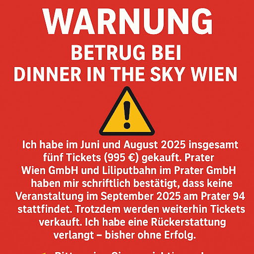 Ich möchte hier meine persönliche Erfahrung teilen, um andere vor einem Betrug zu warnen, der aktuell im Umlauf ist: Nach unzähligen Instagram-Posts über "Dinner in the Sky" am Wiener Prater habe ich beschlossen, spontan für heute (13.09.25) zu buchen. Die Website sah sehr professionell aus, die Zahlung funktionierte einwandfrei, und kurz danach kam auch sofort eine Reservierungsbestätigung per E-Mail – alles wirkte ganz normal. Heute sind wir dann zum Wiener Prater gefahren und haben über eine Stunde lang nach dem Veranstaltungsort gesucht. Schließlich wurden wir von Betreibern vor Ort informiert, dass das Unternehmen seit dem letzten Jahr insolvent ist und es diese Veranstaltung in Wien nicht mehr gibt. Ein Mitarbeiter vor Ort teilte uns mit, dass mehrere Paare bereits in dieselbe Falle getappt sind. Tatsächlich findet man bei aktiver Suche auch Warnungen vom Prater Wien selbst, dass es sich hierbei um einen Betrug handelt. Leider kam diese Info für uns zu spät.