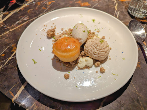Zum Abschluss folgte eine kleine Kombination aus Eis, Mouse und einem Küchlein. Das ganze mit Limette und Szechuanpfeffer. Geschmackssache. Mich persönlich hat dieses Gericht nicht ganz überzeugt. Aber wie gesagt Geschmackssache. Meiner Begleitung hat das ganze gut geschmeckt.
