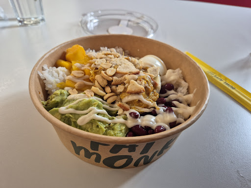 Grundsätzlich hat Fat Monk einen sehr guten Standard Ihrer Bowls . Gut abgestimmte sossen. Leider die selben Standard Dressings und sossen wie bei fast allen anderen bowl Verkäufer. Nichts besonderes . Was sie von den anderen abgrenzt sind vorallem das Pulled chicken als proteineinlage und die greens welche mit süsskartoffelpürree und einem gekochten Ei einmal für Abwechslung sorgen! Die normale Portion kostet 12,50 was ich für den Standort und ebenfalls für einr reichhaltige Einlage mit Ei,Bohnen, Avocado ,Mango und huhn als Gerechtfertigt und fair empfinde.