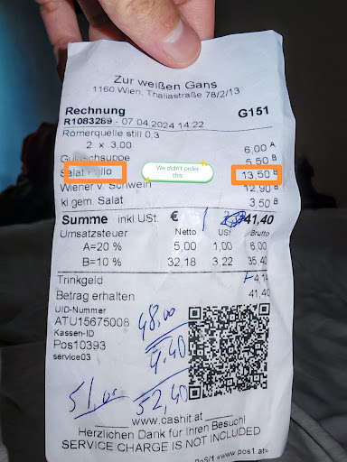 Ich wollte auf daraufhin sowieso nichts mehr essen und bat um die Rechnung. Er ist daraufhin mit der Rechnung gekommen und meinte, es wurde nur das günstigere Schnitzel verrechnet (war ja vermutlich schon so, fälschlicherweise Boniert).