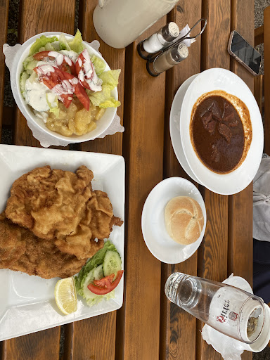 Gegen Abend beschlossen wir, das Grabmüller zu besuchen, und wurden sofort sehr herzlich von Chris, unserem Kellner, empfangen. Flink, freundlich und mit Schmäh bediente er allein den gesamten Gastgarten in professioneller Manier. Auch die Küche ließ nichts zu wünschen übrig; unsere Bestellung kam schnell und war köstlich. Ich entschied mich für ein Putenschnitzel, mein Kollege wählte die Eiernockerl. Es ist ratsam, das Lokal mit leerem Magen zu betreten, denn die Portionsgrößen sind beachtlich. Das goldbraun gebackene Putenschnitzel schmeckte vorzüglich, und die Petersilerdäpfel waren schön buttrig und weich. Nach dem Hauptgericht gönnten wir uns noch eine Nachspeise: einen Mohr im Hemd und Nutellapalatschinken. Auch diese waren ein Genuss und sättigten uns vollends.