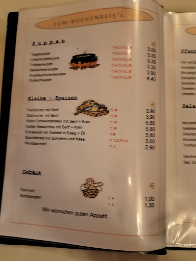 In Buchen Beisl kennt man sich. Vorwiegend Männer ab 50, teilweise in Arbeitskleidung und Pensionisten. Hier wird politisiert, gewitzelt und philosophiert, an der Bar gestanden das obligatorische Gösser vor sich am Tresen. Auch eine Gruppe Kartenspieler ist zugegen. Ein zweigängiges Mittagsmenü, Suppe und drei Gerichte zur Auswahl - wobei täglich ein Wiener Schnitzel vom Schwein dabei ist, um unschlagbare € 6,70.