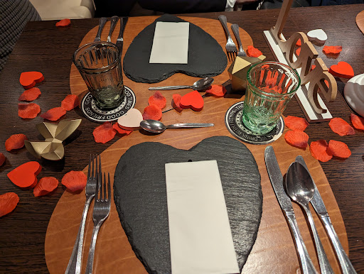 Read moreWhile the food was decent at times the overall feeling of this place is cheap and tacky. The only reason we ended up at this place was due to getting a gift certificate. They market themselves as a romantic dinner type spot but if this is the case they need to call in a decorator because there is nothing romantic about the blinding lights and the plastic hearts strewn out on the table. Staff were nice enough although apparently did not receive have our reservation handy which caused some confusion. The food has potential. My main dish of the veal was cooked perfectly although I didn’t touch any of the pesto type paste it served with. Desert was probably the only part lacking where you get two gelatin type deserts along with a small bit of chocolate cake and some mint ice cream that tasted like toothpaste. Overall, there is a lot of work that needs to be done in making this place worth the...