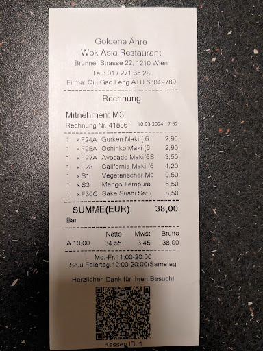 Read moreGünstige Preise, mittelmäßige Qualität (aber Preis/Leistung ist in Ordnung) - Bedienung hat Probleme mit der deutschen Sprache und den Gesetzen (erkennen die österreichweit auch als Genesungsbescheide anerkannten Absonderungsbescheide nicht an, Kinder müssen möglichst geimpft sein, der Ninjapass gilt nicht und der PCR-Befund gilt nur 2 Tage statt 3!!)! Alles in Allem: ein paar Meter weiter gibt es einen 2. Asiaten, der freundlicher ist. Ich wollte bezüglich des 2G-Problems der Bedienung helfen - sie ist leider SEHR arrogant und...