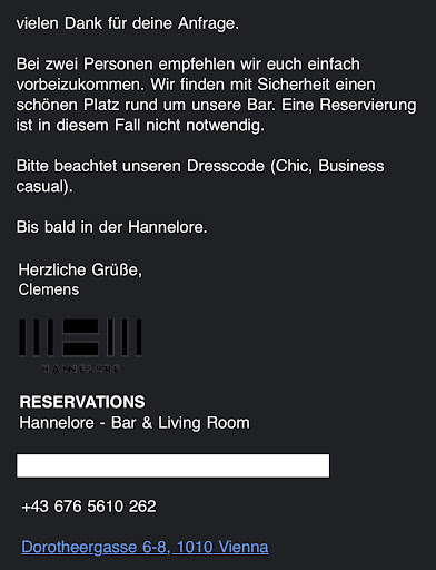 Read moreI recently visited Hannelore, a Bar & Club located in the heart of Vienna, Austria. However, my experience was unfortunately negative due to the discriminatory behavior of the bouncer at the door. Despite people entering without stating whether they had a reservation or not, I was refused entry as I did not have a table reservation. When I tried to reason with the bouncer, it became clear that my race was the reason for his discriminatory behavior towards me. This was particularly upsetting as I saw other people being let in without any issues.