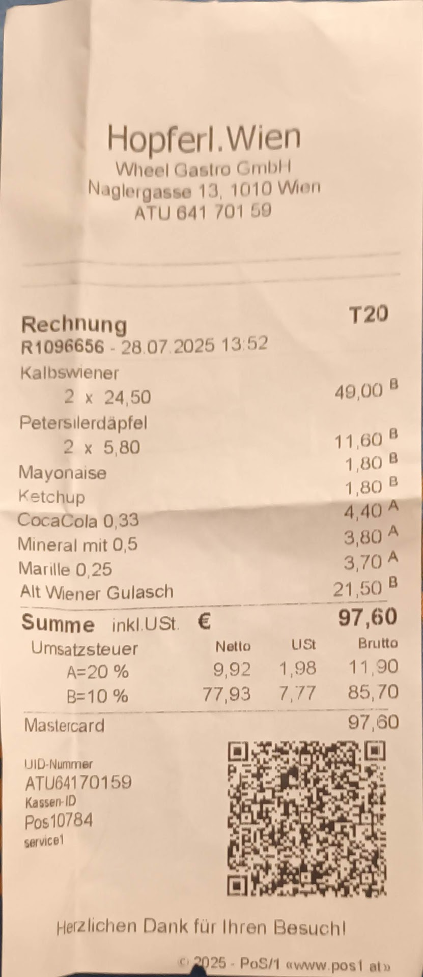 However, when it was time to pay, due to the language barrier, he added several items that we didn’t imagine would be included—like mayonnaise and ketchup, each of which was almost two euros. On top of that, I believe in bad faith he charged us for parsley potatoes at almost six euros each, listing them as a potato salad, which is usually served as a side with the typical Viennese dish, Kalbswiener, and which was already quite expensive compared to the average in Vienna.