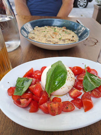 With the withering heat, we both chose to eat fairly light. The choice for my DW was a simple tomato and burrata salad with fresh basil and simply dressed with EVOO and fresh cracked black pepper. As with 95% of our orders this trip, the tomatoes were outstanding and it’s hard to go wrong with fresh burrata under any circumstances. The dish was perfect. My starter mista salad was excellent just mixed greens, tomatoes, cucumber in a house dressing. dressing was light on flavor but let the vegetables shine through. I chose the risotto funghi-risotto cooked in a white wine, onion, and garlic broth plus two different kinds of mushrooms as my entrée. It’s rare I choose to order a dish that doesn’t include any animal protein (sorry carnivore here) but this dish turned out to be a great choice for a hot day. delicious flavor profile and risotto cooked perfectly. nary a speck was left behind. service was a bit slow with the number of diners here but not annoyingly. one of the few places we dined in during our trip that brought us a carafe of ice-cold water for no additional charge. very welcome....