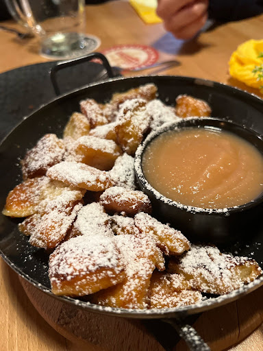 I hate to say it but the service was really bad. The restaurant was fairly busy, when we got in I ordered a cocktail and the waiter complained about having to make it because it was busy and there were only 2 waiters working, he said it would take a long time to make which I was fine with. When it turned up it was so strong it was near un-drinkable. My partner ordered the fish with potato salad (he’s pescatarian) the vegetarian options are just cheese basically, they delivered our food and his was a whole chicken leg with pasta, we said it was wrong. The waiter said he’d ordered it wrong but asked if we’d eat the chicken anyway and seemed annoyed when we said he wouldn’t. Then after a long wait we got someone’s attention and ordered the kaiserschmarrn the waiter said they didn’t sell that, we pointed to it on the menu, he said ok. We waited 30 minutes and no dessert, we asked the waiter and he said the kitchen said it was finished and they wouldn’t make it. We said fine can we get the bill, waiting another 10 minutes and no bill arrive. Went to the bar to pay and while one waiter was clearer glasses (at 9:50pm so nearly closed, not vital to clear tables) the other waiter was just chatting to some men and looked put out that we wanted to pay. Left feeling thoroughly annoyed and like we’d wasted a lot of time there and been treated fairly rudely. Food tasted fine but absolutely not worth the hassle, go somewhere...