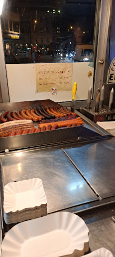 A typical small Viennese Wurstelstand - a street stand offering various sausages with some bread.
