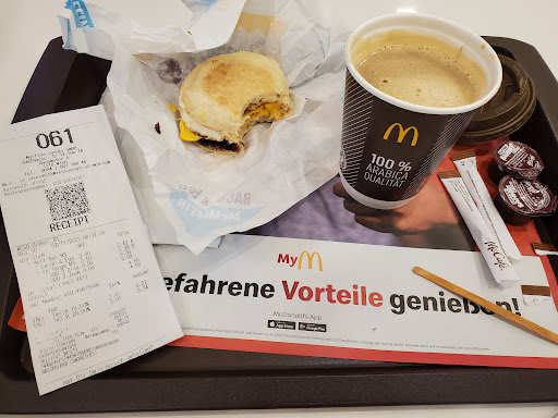 A normal McDonald's, the people serving are always busy the place has little space to sit down, and the McDonald's and McCafe are in different parts of the building, which is a small gripe, but adds to the frustrations. The wait for the food was relatively small, so I cannot subtract any points for that, what I can subtract points for is the fact I didn't even know if there was a McCafe in the building even though it said McCafe on the building's side. Prices are average, and at the time of writing a large menu will cost you from 7.40€ to 8.70€ depending on your choices. Also the only toilet is also in a different part of the building on the 2nd floor (McDonald's is on the...