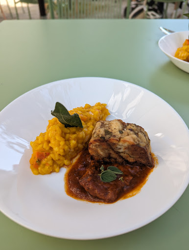 Read moreWir waren hier im Zuge der Gusto Guerilla Tour und durften kostenlos zwei Speisen verkosten, nämlich ein veganes Kürbisrisotto sowie ein veganes Gulasch mit Knödel. Beide Gerichte waren wirklich außergewöhnlich gut, auch ich als nicht-veganer würde diese Gerichte so auch für Geld bestellen. Das Risotto war cremig und geschmackvoll und hatte einen besseren Geschmack als andere, die ich kenne, weil es nicht mit Parmesan zugeschüttet war. Das Gulasch war ebenso gut und das Knödel hatte eine fantastische Konsistenz. Die Speisen wurden vom Koch persönlich gebracht und präsentiert, anschließend kam er auch die Teller holen und fragte nach Feedback und gab uns sogar noch Tipps für Zuhause dabei. (Wir waren vom frittierten Salbei fasziniert, er hat uns erklärt, wie man diesen ganz leicht Zuhause macht.) Das gesamte Personal war äußerst freundlich, zuvorkommend und witzig und die Atmosphäre locker und gemütlich. Sollte ich Mal wieder in der Gegend und hungrig sein, werde ich mir das Mimi im Stadtelefanten mit...
