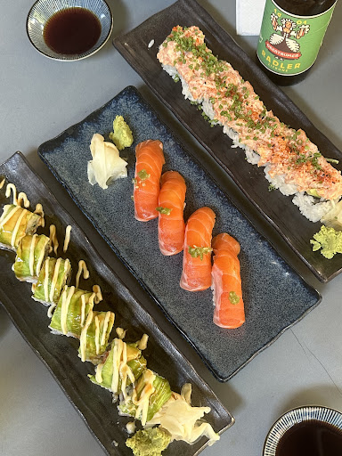 Food recs: Top - spicy salmon roll (w avocado inside I think) Middle - sushi sake (salmon) Bottom - Dana roll (salmon cucumber & avo on top)