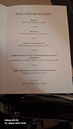 Waren zum 2x Menü mit 1x Weinbegleitung da. Leider sehr kleine Tische für 2 Personen wo kaum Essen hin passt. Wenn man zur Toilette geht, muss ein andere Tisch aufstehen, da Tische sehr eng stehen. Könnte besser sein. Qualität sollte Quantität übertreffen - auch bei dem Inventar. Es war eine Veranstaltung mit Gästen von Christ Weine, Wirtschafskammer; Christoph Fälbl war auch da, weshalb die Kellner offensichtlich nicht so oft zu uns kamen. Wir hätten gerne mehr Getränke bestellt. Die Speisen war insgesamt durchschnittlich. Mein Mann ist allerdings oft in Sterneküchen zum Mitkochen/Essen zu Gast u sehr verwöhnt. Das Mousse hat uns nicht ganz überzeugt. Die Weine waren im Mittelfeld. Sekt zu Beginn war nicht unser Geschmack. Weine sehr mild. Der Rotwein war der Beste, aber leider mit Weinstein. Zur Nachspeise gab eine Spätlese, wo wir auch schon Besseres getrunken haben. Interessant, dass die Weißweine immer im selben Glas serviert wurden inkl Spätlese. Reste vom vorigen Glas wurden einfach übergossen...Kenne ich von andere Lokale oder Weinkeller nicht. Es gab keine Getränkekarte. Mein Mann trinkt viel (Bier bzw antialkoholisches Bier) u wurde nicht einmal gefragt, ob er ein Weiteres will. Er saß lange mit leeren Glas da. Teller wurden lange stehen gelassen. Fazit: nettes Lokal mit wenig Platz zwischen den Tischen, kleine 2er Tische u Sessel. Gute Atmosphäre. Inhaber hat sich nur mit der Prominenz unterhalten. Wir hätten Fragen zum Essen gehabt, was aber nicht verraten wurde. Allergene wurden nicht angegeben. Keine Erfahrung der Kellner, wie man Wein serviert. Selbes Glas zu sämtlichen Weinen (Sekt u alle Weißweine?) und 2 Weine süß im selben Glas... Eine Erklärung dazu würde uns interessieren. Falstaff hat hier Empfehlung gegeben. Nicht...