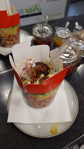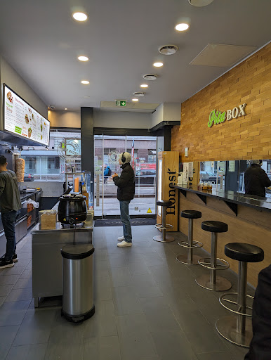 5,9 Euro für Hühnerkebab, rundes getoastetes Brot, Portion OK ich war zu Mittag dort und sowohl vor als auch nach mir waren einige Kunden, dürfte also beliebt sein. Ich bin eigentlich wegen dem veganen Döner gekommen, der überall so hoch gelobt wird. Vor Ort sehe ich dann aber, dass es auch einen klassischen Hühnerkebab gibt. Ich bestelle mal einen veganen Kebab, mein Blick bleibt aber am Hühnerspieß hängen und dürfte derartig leidenschaftlich gewesen sein, dass der Verkäufer mich plötzlich aus meinem Tagtraum reißt und mich anspricht mit den Worten "Keine Sorge, bis der Kebab gemacht wird ist es auch knusprig. Magst du auch einen Hühnerkebab?". Also bestelle ich auch noch einen Hühnerkebab. :) ich werde hier den Hühnerkebab bewerten und dann ein zweites Review für den veganen machen. Der Spieß durfte sich also noch etwas drehen während mein veganer Kebab zubereitet wurde. Allerdings meiner Meinung nach auch noch etwas zu wenig. Schon klar, zu Mittag wird mehr Fleisch benötigt und daher wird eben schon etwas früher heruntergeschnitten. Knusprig wars also leider nicht. Für mich gerade an der untersten Grenze vom Bräunungsgrad. Etwas schade, wurde mir ja extra versprochen, dass das Fleisch knusprig sein wird. :( Zum Geschmack kann ich ehrlichweise nicht viel sagen, weil es in den Hummus gelegt wurde und eigentlich nur danach geschmeckt hat. das Brot war spitze! Mal ganz was anderes als sonst üblich. ein getoastetes rundes eher festeres Sandwichbrot mit viel Sesam. Aber keines dieser Pizzateigbrote sondern ein luftiges Fladenbrot, aber stark getoastet. Dadurch hatte es geile Toastaromen und ausserdem war der gesamte Deckel mit viel Sesam bedeckt. Das Brot alleine hat mir sehr gut geschmeckt und eben ganz anders als sonst üblich. Obwohl es so gut getoastet war hat es sich dennoch sehr gut essen lassen ohne zu brechen. Direkt ins Brot wurde der Hummus geschmiert. Hier konnte man zwischen Chili-, Wasabi-, Mango-, Curry- und normalem Humus wählen. Ich entschied mich für "wie es am besten schmeckt" und bekam den Chilihummus. Darauf kam dann das Fleisch und dann gleich die Yoghurtsauce. Die Yoghurtsauce schmeckt sooo verdammt gut und klassisch, genauso wie ich es mir vorstelle wenn ich an Yoghurtsauce denke. Perfekt! Der Chilihummus hat auch gut geschmeckt, allerdings hat er mich sehr stark an Liptauer erinnert. Er war ganz minimal leicht scharf und im Nachhinein zwar gut für die Cremigkeit, vom Geschmack her aber einfach zu viel weil es eben fast alles überdeckt hat. Danach kamen Eisbergsalat, Rotkraut, halbe weiße dickgeschnittene Zwiebelringe und halbe dünngeschnittene Tomatenscheiben rein. Auch das ist untypisch, normalerweise bekommt man Zwiebel immer sehr dünn geschnitten, hier aber recht grob. - und ich liebe es!! - denn so hat man einfach einen intensiveren Geschmack. Für alle die ihren Kebab generell ohne Zwiebel essen: 1) schade für euch! Man kann so gut wie alles bei einem Kebab weglassen, aber Zwiebel MÜSSEN rein. 2) hier solltet ihr dann wirklich lieber verzichten:D scharfes Pulver kam noch oben drauf, hätte ich aber nicht wahrgenommen - weder von der Schärfe noch vom Geschmack. Belegt war der Kebab sehr gut und hat sich auch sehr gut essen lassen. Obendrein sah er auch einfach sehr ansprechend aus. der Chef ist wahnsinnig freundlich und scheinbar auch extrem aufmerksam wenn ich daran denke dass er es geschafft hat mir einen Kebab zu verkaufen nur weil er meinen sehnsüchtigen Blick korrekt deuten konnte. Fazit: der Kebab war sehr gut! Das Brot war top und hier wären 5 Punkte drin. Aber das Fleisch war leider nicht knusprig - wie eigentlich versprochen ;) - und man hat es auch kaum geschmeckt wegen dem vielen Hummus. Ebenso gehe ich beim Fleisch von einem Standardspieß aus und keinem selbstgesteckten (das ist jetzt aber nur eine Vermutung). Alles in allem ein sehr guter Kebab den ich sofort wieder essen würde und empfehlen kann. Das Brot bekommt von mir 5 Punkte. 4/5 Döner!
