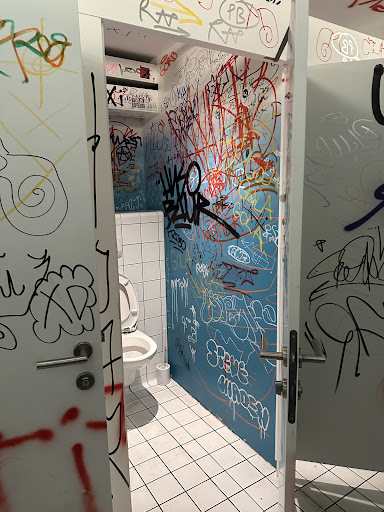 (Picture of the restrooms, nice look because of the drawings and tags, quite clean for a...