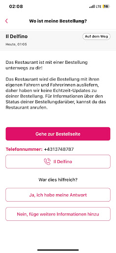 War erstmal baff ruf dort beim Restaurant an kurz vorm Ende um 01:40-01:55 meinte er zu mir ja er sei in 4 Minuten da .