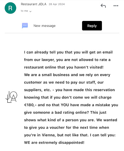 (Edit: they emailed me that âI can already tell you that you will get an email from our lawyer, you are not allowed to rate a restaurant online that you haven't visited!â. Wow. I guess this is a part of how you keep the 5* rating here- by trying to intimidate people.)