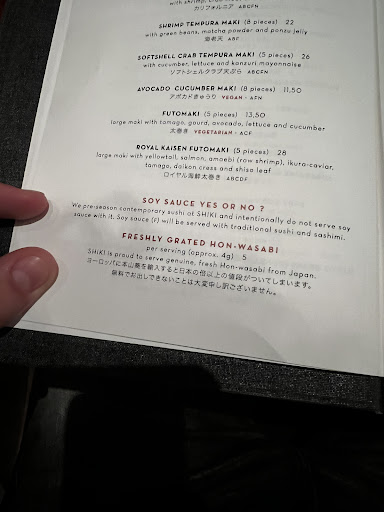 Honestly I was really disappointed. I was at shiki for the first time this weekend with my family to celebrate my birthday but unfortunately we really didn't have a memorable experience. The food quality/price ratio is definitely an issue in this restaurant, 70 euro for a tiny pice of black cod? 7 euro for one tuna nigiri? But wait the most amazing one of all; 5 euro for freshly grated wasabi. This is really a first one. I have been all my life eating in high end Japanese restaurants around the world but I have to be honest I have never but never had to pay for wasabi before. (To me is obvious that is you go to a low quality Japanese restaurant they give you the bright green almost uranium color wasabi, but if I spend more then 100 euro each for 2 plates in a high end restaurant I should even have to choose to pay for the freshly grated wasabi because it should be the only one served) I’m Italian and I can make you a simple example that to me can be easily compared to this senario; you go to a high end Italian restaurant and you ask them for Parmesan (expensive product) and they tell you well sir you have 2 choices: we either bring you the complementary fake Italian mixed cheese or we bring you Parmigiano Reggiano from Italy for extra? Like what?? Are you a high end restaurant or no? Cuz if you would be you wouldn’t serve the cheep substitute of such a important and traditional product of a cuisine as Parmesan or in this case WASABI.