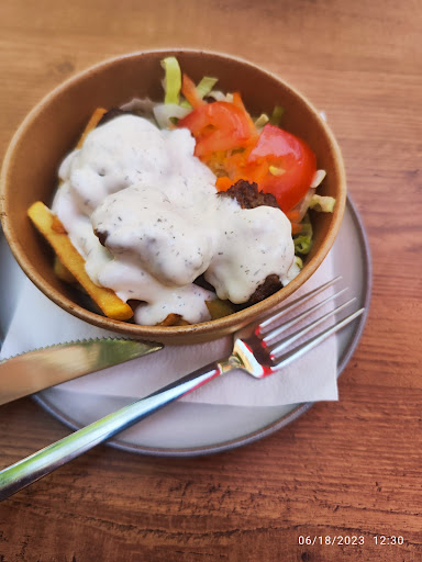 We ordered the Döner wrap(5.5 Euros) and a Köfte bowl (11.5 Euros). The Döner was made of tortilla bread and some chicken wrapped with salad. However, the menu does not specify that it is chicken. The köfte bowl had 3 walnut sized patties with mostly salad, and some soggy fries drenched in white runny sauce. The portion size of the köfte bowl was not worth it as 11.5 euros should get you a one portion meal but this was more like a...