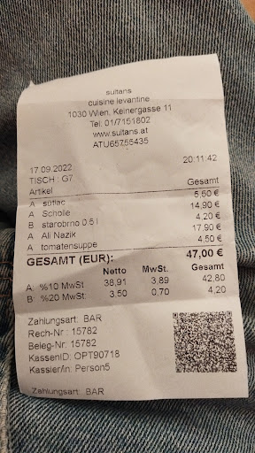 Read moreEines meiner liebsten Speiselokale in Wien. Sowohl meine Frau als auch ich sind immer wieder begeistert von der Qualität und der Vielfalt an Speisen, die geboten werden. Allein das Lamm ist es wert, das Lokal zu besuchen. Aber auch Vegetarier werden auf ihre Kosten kommen, sogar ich als ausgesprochener Fleischliebhaber ertappe mich dabei, vegetarisches zu bestellen. Das Personal, allen voran der Chef, sind stets freundlich, kompetent und zuvorkommend und behalten auch bei vollem Haus die Übersicht und finden Zeit für ein freundliches Wort. Das Interieur wird laufend verbessert, was bei laufendem Betrieb sicher nicht einfach zu bewerkstelligen ist, man sieht aber die kleinen Schritte, die gemacht werden, sehr deutlich. Die Preise sind angemessen, auch die Auswahl an Getränken sollte keine Wünsche offen lassen. Im Sommer steht ein Gastgarten zur Verfügung, er ist schön mit großen Topfpflanzen vom Gehweg getrennt. Wir können Sultans cuisine levantine nur empfehlen, wir haben schon Freunde und Kollegen hingebracht und keiner...