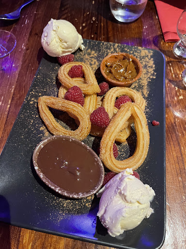 Dessert - Homemade Churros Holy heaven. Warm churros, fried to perfection, rolled in cinnamon and sugar. Served with melted chunks of milk chocolate and melted chunks of white chocolate. Definitely enough for two!