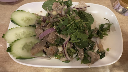 Yam nuea - spicy beef salad. I eat spicier food than almost anybody I’ve ever met so I wished it was a little spicier, but it is still a great tasting beef salad and I got some chilies from the tray to spice it up a bit more. This was good and refreshing especially on a warm day.
