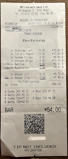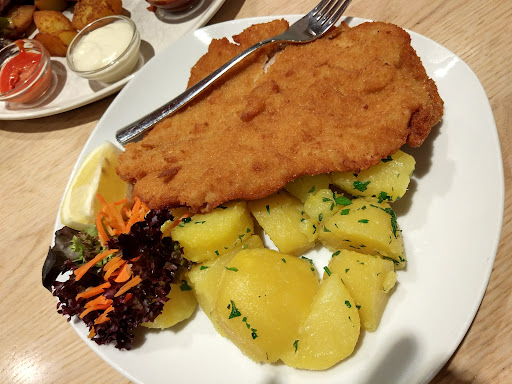 I had the original Viennese schnitzel (veal) with parsley potatoes. Firstly, though it is large, do not expect it to be full of meat as per my photo. Second, it was a very average schnitzel. I've had much better from random pubs in Australia... Or the fast food chain Schnitz. It's not the coating that's the problem (actually pleasantly crunchy) but the meat itself. The texture when eating was almost like a weird mince though I could see it was not. The potatoes were nice and seemed to have a light creamy coating.