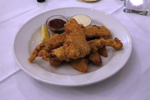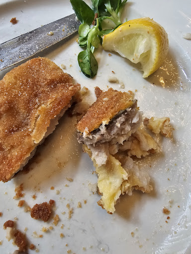Der Karpfen wurde offensichtlich vor dem Panieren nicht gesalzen und war trocken. Wenn die Filets nicht vor der Verarbeitung gesalzen werden, kannst du auf die Panier salzen, so viel du willst. Das wird nichts mehr. Beim zweiten Bissen fiel auf, dass es ein bisschen nach Eierspeise schmeckt und siehe da, die Filets waren nicht ausreichend abgetropft und es fand sich bei beiden Portionen gestocktes Eigelb unter der Panier. (Siehe Foto)