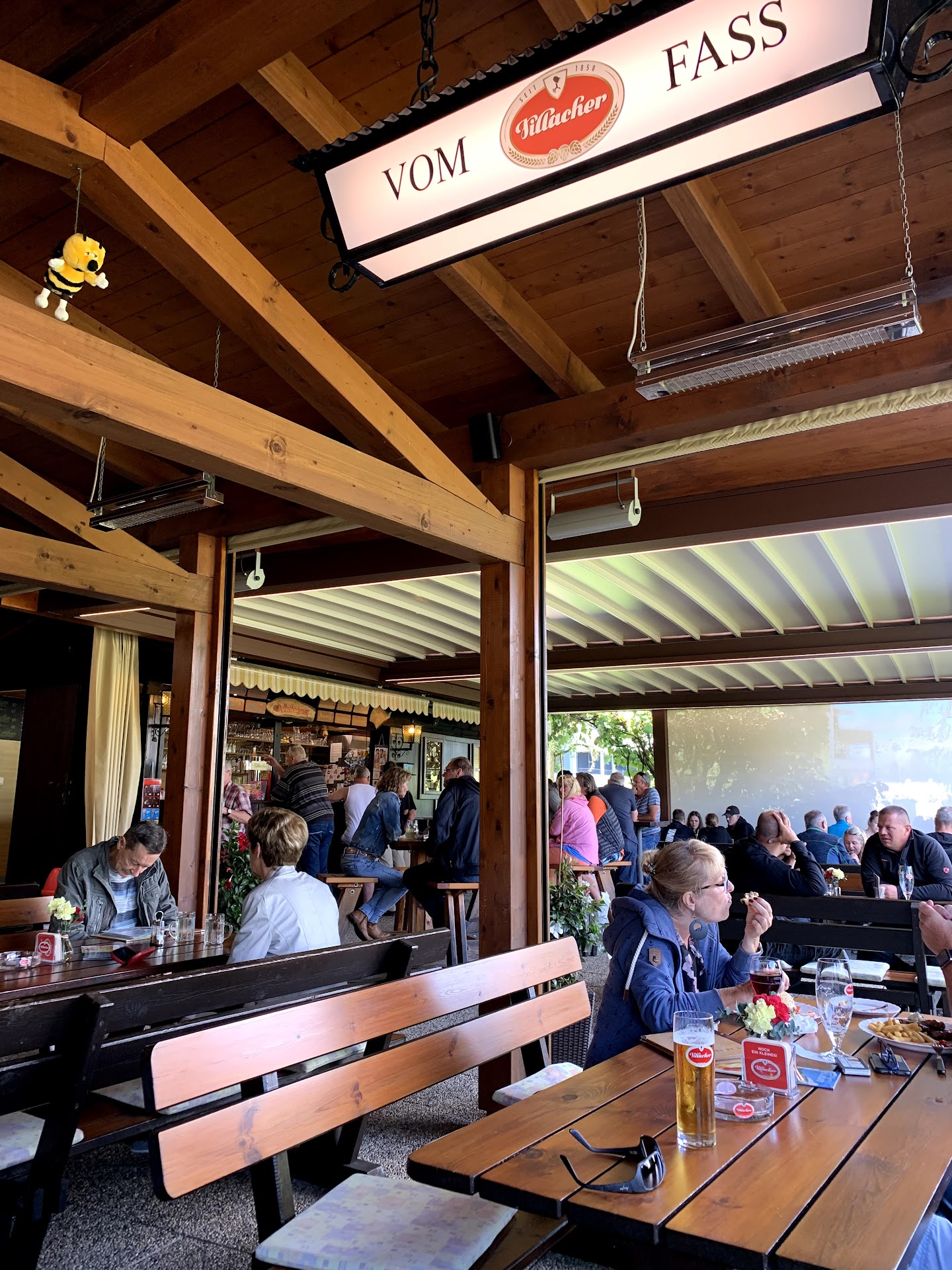 Read moreWir legen heute eine Zwischenübernachtung am Faaker See ein und zum Abendessen landeten wir in der Bienenhütte. Anfangs waren alle Tische voll besetzt, sodass wir etwas Wartezeit in Kauf nehmen mussten. Wichtig: in der Bienenhütte herrscht Selbstbedienung! Das heißt man bekommt eine Speisekarte an den Tisch gebracht, sucht sich etwas aus, geht dann an den Tresen, bestellt und bezahlt. Und dann bekommt man seine Getränke+ Essen von den Kellnern an den Tisch gebracht. Die Speisekarte ist überschaubar, von Salaten über Schnitzel/Fleischgerichten/Hamburger/Pizza bis zu vegetarischen Alternativen. Die Essenspreise sind für österreichische Verhältnisse günstig (würde ich sagen). Die Getränkepreise, hm naja mein "Durstlöscher" ( Soda mit Holunder) 0,5 Liter kam 3,50 Euro und das alkoholfreie Hefeweizen 0,5 Liter kam 5,20 Euro ( das fand ich recht teuer). Das Ambiente an sich war gemütlich und einladend. Ich würde auch ein weiteres Mal...