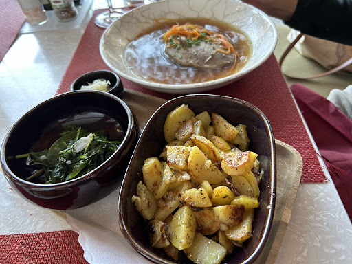 Wir sind in das Restaurant angekommen, es verfügt auf der Wetter abgewandten Seite über ein großes Schleppdach . Hier war auch noch ein Tisch frei. Der ”Chef“, verwehrte uns jedoch vehement diesen Tisch und zwang uns, auf eine bereits unangenehme Art, an einem Tisch im Lokal. An diesem 1,20x1,20 Tisch mit Stühlen für Jugendliche, fühlten wir uns sofort unwohl. Nach einigen Schwierigkeiten mit der Bestellung,( wegen Sprachprobleme) , wurden wir doch gut umsorgt vom Servicepersonal. Die Karte sah gut aus, und wir hatten alle was gefunden. Flasche Wein dazu… alles gut. Nach der Bestellung habe ich aus dem Sammelsurium von Möbilar, ein paar gut sitzende Stühle mit leeren Tischen getauscht, danach ging das mit dem Sitzen auch . Dann aber, hat einen der Kellner, das verbliebene geöffnete Fenster auf der Wetter abgewandten Seite verschlossen. In der ohnehin Akustisch und Klimatisch ungemütlichen Esshalle fing ich nach 5 Minuten an zu Schwitzen. Wir hatten uns auf einen gemütlichen Abend gefreut, und davon war bei diesen Vorraussetzungen, nicht mehr viel übrig. Also, fragte ich erneut, ( jetzt beim Kellner), ob wir nicht unter dem Schleppdach sitzen können. Dieser sah das ganze nicht so kompliziert und bejahte unser vorhaben. So saßen wir schnell auf unserem Wunschplatz, und alles war gut. Der Kellner sagte noch, er könne eh nicht verstehen weshalb wir rein mussten, ihm wäre egal wo wir sitzen. Dann kam der Chef wieder ums Eck, und befahl bestimmten Tischen, ( befremdlicherweise nicht alle), wg des Wetters hinein zu gehen. Alle befolgten diesen Befehl, nur wir nicht. Ich wollte auf gar keinen Fall in diesen Stickigen Saal zurück. In diesem Moment fing es ziemlich stark zu regnen an, und auch gab es ein leichtes Gewitter. Wir lieben es, sowas zu genießen und zu beobachten. Jedoch, der CHEF, war unerbittlich. Nach einer kurzen Diskussion, hat uns der Wirt dann seines Lokals verwiesen, auf nimmer wiedersehen. Ich denke dieser Herr sollte lieber der Kundschaft fern bleiben. Sowas habe ich in meinem ganzen Leben...