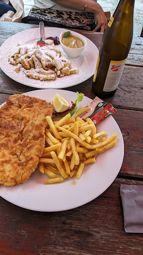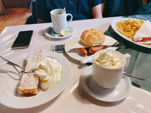 This place gets busy mid-day, say late lunch time (14h), so be prepared. We had to sit inside due to some off-and-on sprinkles. I had the Austrian mac-and-cheese, which really was two meals, and tasted good. My friend had the goulash soup, which was very tasty. We had a beer each (hey, in Germany and Austria, beer is literally cheaper than water) and the bill came out to 45 EUR. The service was friendly...the staff wears traditional Austrian garb while they work to add to the old-world charm this schnitzel house on top of the Alps naturally gives off.