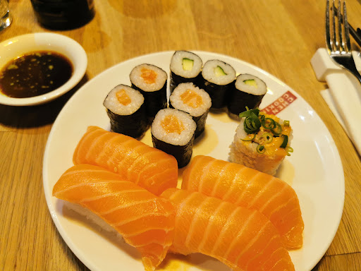 Zum Essen: Der Sushi Reis war körnig und hart. Der Lachs hatte meiner meinung nach gefischelt. Also für das Sushi Schulnote 4-5.