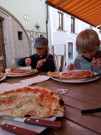 Read moreРасположение - тихий пешеходный проулок в центре. Интерьер - скромно, несколько столиков внутри и снаружи. Печь по средине заведения. Интересно наблюдать за пиццайло. Чисто и аккуратно везде, включая туалет. Меню - большой выбор пиццы, в одноосновном классической. Не большой выбор напитков и десертов, есть алкоголь. Пицца - очень вкусная и тоненькая, начинки много. Одной пиццы хватает на двоих взрослых. Для детей брали пиццу с ветчиной, себе "quattro formaggi" или "4 сыра" по нашему. Десерты - профитроли в шоколадном соусе с кремом и тирамису - вкусно. Обслуживание - выше всяких похвал. Официант, возможно хозяин, точно сказать не могу итальянец или австриец с итальянским темпераментом, обсуживал быстро, громко и с юмором. При этом абсолютно не навязчиво - супер. Ценны: пицца от 8.5 до 12 евро за пиццу. Напитки: пиво 0,33 и бокал просекко - по 3.5 евро. Вывод: идеально для тихого ужина в приятной компании...