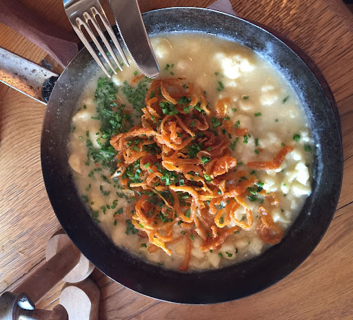 Es musste einfach sein, so unangenehm uns so etwas ist und so schwer es uns fällt, diese Schmach von Käsespätzle mussten reklamiert werden - alleine schon um eine mögliche Ehrenrettung des Gerichtes Willen. So dürften uns Käsespätzle niemals in Erinnerung bleiben, niemandem! Leicht unterwürfig und peinlich berührt trug ich unserer Bedienung vor, dass unsere beiden Portionen dann doch außergewöhnlich wässrig seien. Nach einem kurzen Blick in unsere Pfannen entgegnete Sie uns relativ humorlos: “Die sind hier eben so”. Etwas verdutzt wurden wir zurückgelassen. So konnte diese Tragödie nicht enden, beherzt machte ich mich auf den Weg an die Bar, dort wollte ich einem anderen Angestellten (einer anderen Angestellten) erneut vom Ernst der Lage berichten. Tatsächlich hatte eine Dame ein Einsehen und kurze Zeit später wurden unsere beiden "Suppen" (mit dem Hinweis auf zwei neue Portionen) abgeholt. Leicht unterwürfig und peinlich berührt trug ich unserer Bedienung vor, dass unsere beiden Portionen dann doch außergewöhnlich wässrig seien. Nach einem kurzen Blick in unsere Pfannen entgegnete Sie uns relativ humorlos: “Die sind hier eben so”. Etwas verdutzt wurden wir zurückgelassen. So konnte diese Tragödie nicht enden, beherzt machte ich mich auf den Weg an die Bar, dort wollte ich einem anderen Angestellten (einer anderen Angestellten) erneut vom Ernst der Lage berichten. Tatsächlich hatte eine Dame ein Einsehen und kurze Zeit später wurden unsere beiden "Suppen" (mit dem Hinweis auf zwei neue Portionen) abgeholt.