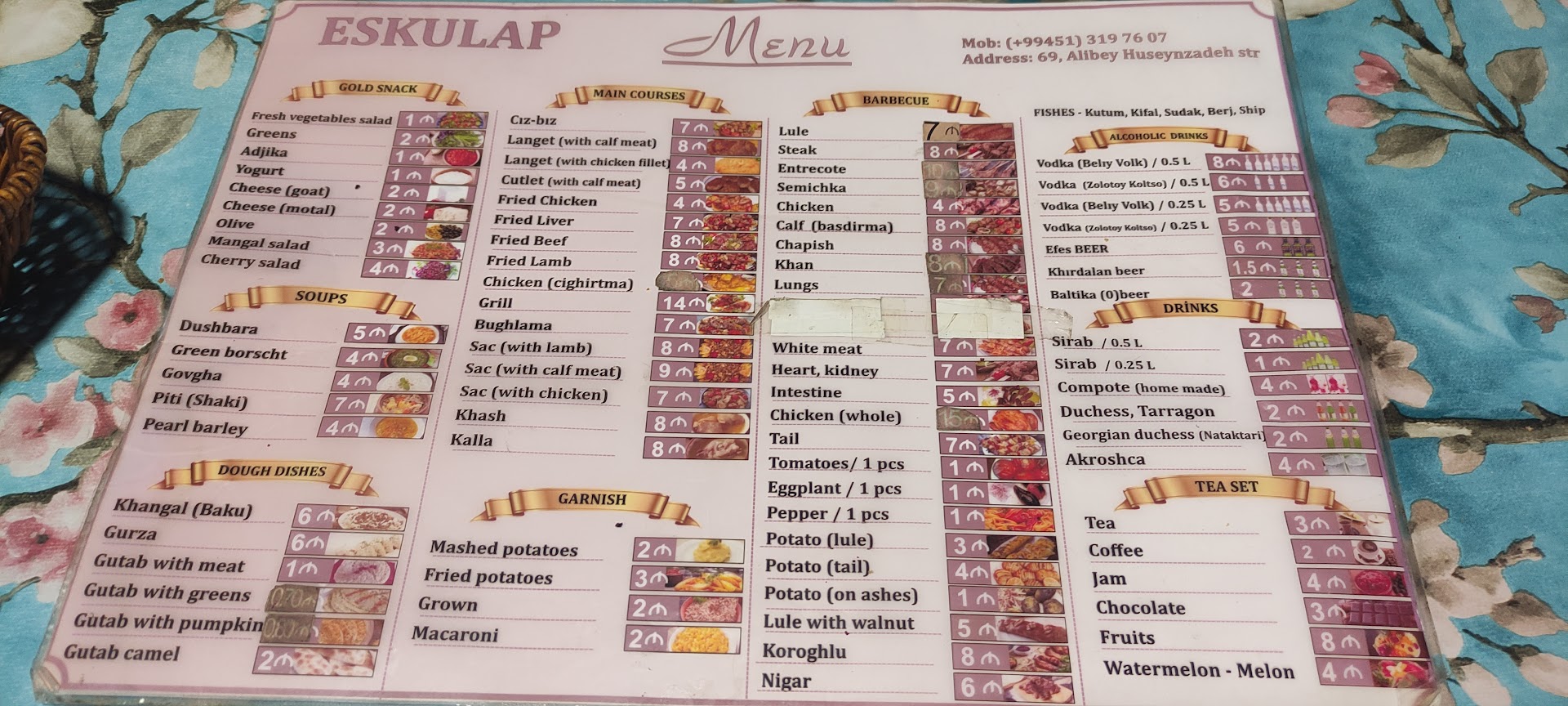 We added up what we ordered and our bill should’ve been 64.6manat. In the end they told us that it’s +1 for bread (we did not order bread, they served it on their own accord) +2 for big piece of pork (did not tell us in advance) +10 for salad (menu says salad costs 1manat - complete nonsense). In the end we settled for 70manat