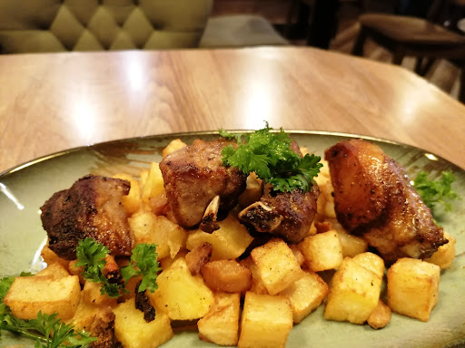 Ordered: Mushroom soup: 5/5 Baku eggplant: 4.5/5 (cubes of fried eggplant with sesame seeds and a piquant sauce) Tasty but could have supplied more diced tomato. Chicken Kiev with peas and potato: 5/5 Chicken Kiev was very well-prepared. Asked that they omit the ketchup and it was omitted as requested. Very small quantity of peas (delicious but were already cold) Potatoes, large wedges apparently fried, were tasty but would have preferred mashed with the chicken Kiev Pork ribs with potato cubes: 2/5 Four ribs, mostly bone, was supplied and the quantity of potato relative to meat was highly skewed: a lot of potato, little meat. Needed my serrated knife to cut what meat was on the bone. The pork was not piquaint. Would have been better had they supplied a single rib with ample meat. What I was served for 21 manat was poor value for money. I preferred the potato that was served with the chicken Kiev more than the potato served with the ribs. Blini with cottage cheese: 5/5 served with sour cream but with no extraneous sauce (as requested) Washed down with a liter of kvass: 5/5. In the past I have ordered from. Mama Nakormila barbecued ribs, which were delicious but expensive; however, although expensive, they were worth the expense. The ribs I described above were extremely poor in comparison. I don't want to penalize the restaurant unduly for one sub-par entree but I would have better suited me either to have ordered a double portion of the chicken kiev or to have enquired whether the expensive pork ribs I ordered previously from a separate hand-written menu...