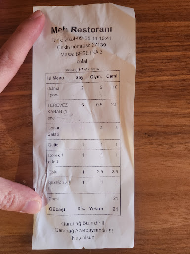 Read moreБеседки в этом ресторане открытые - большой минус - надоедливые мухи. Хотели заказать girs и sürhüllü, но, к сожалению, нам сказали, что газ в заведении отключили, поэтому не смогут приготовить. Заказали долму из виноградных листьев (2 порции), шашлык из овощей и чобан-салат. Долма не понравилась. За всё...