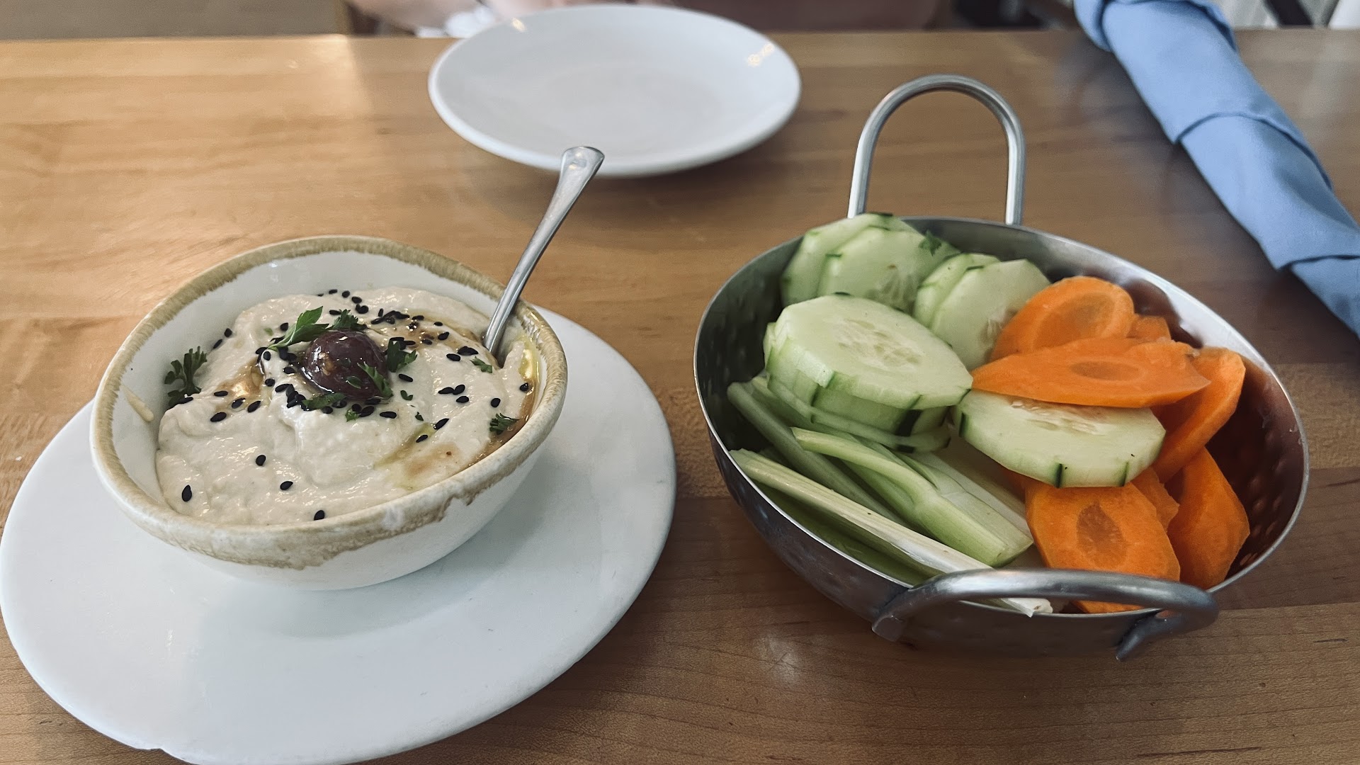 I was so happy to have some fresh vegetables! Crisp and refreshing. They were great and so was the silky smooth hummus with a light consistency. The sandwich was very good and filling. I got a Greek salad with delicious shrimp. It was like a side salad. We shared. I would order just the shrimp but the salad was delicious too with just the right amount of dressing.